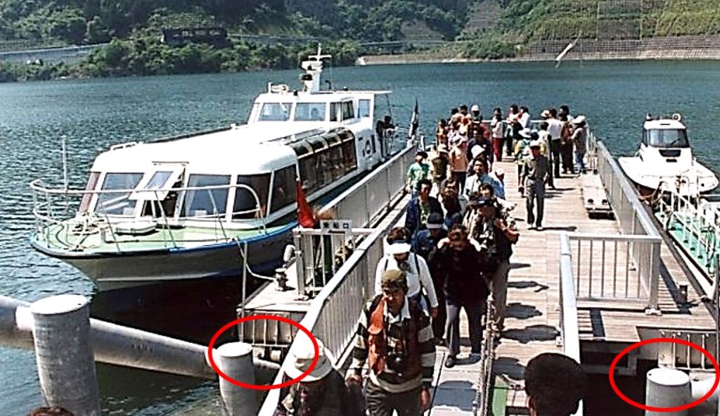 答えは観光案内系のサイトを調べると見つかり,水位により高さが変わる浮桟橋のガイドレールと判明しました.遊覧船の修理と同時に浮桟橋も撤去(同時修理中?)されており,正体が分かりにくかった訳です.