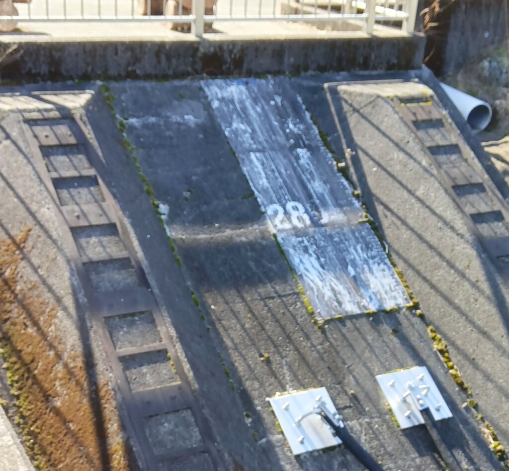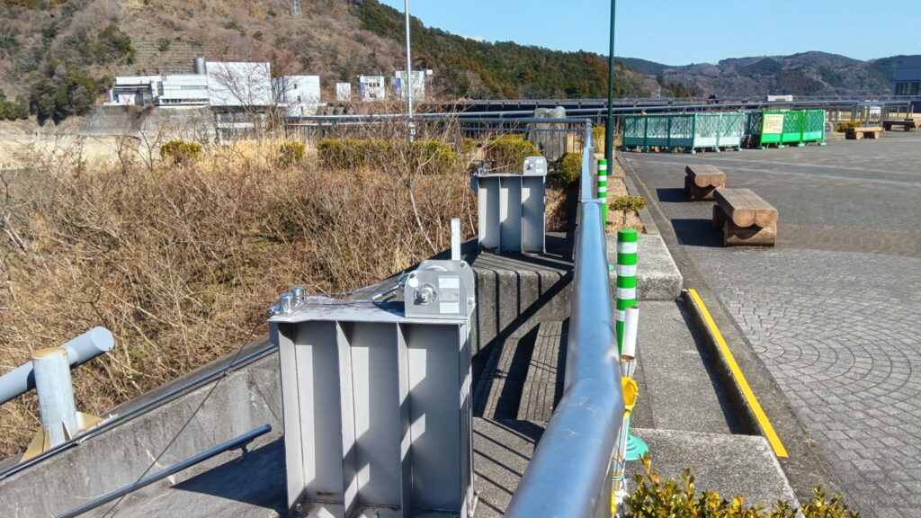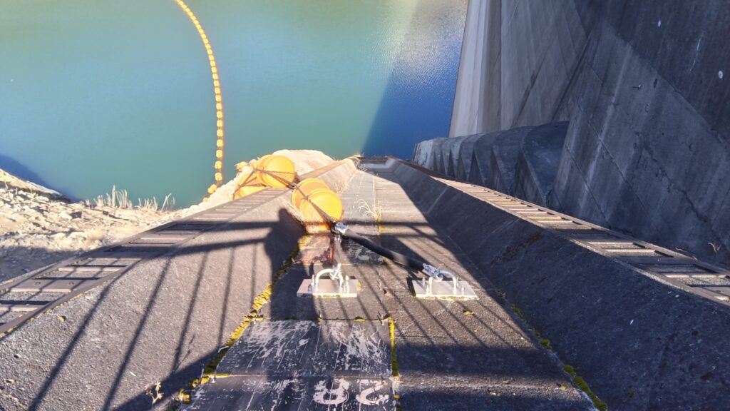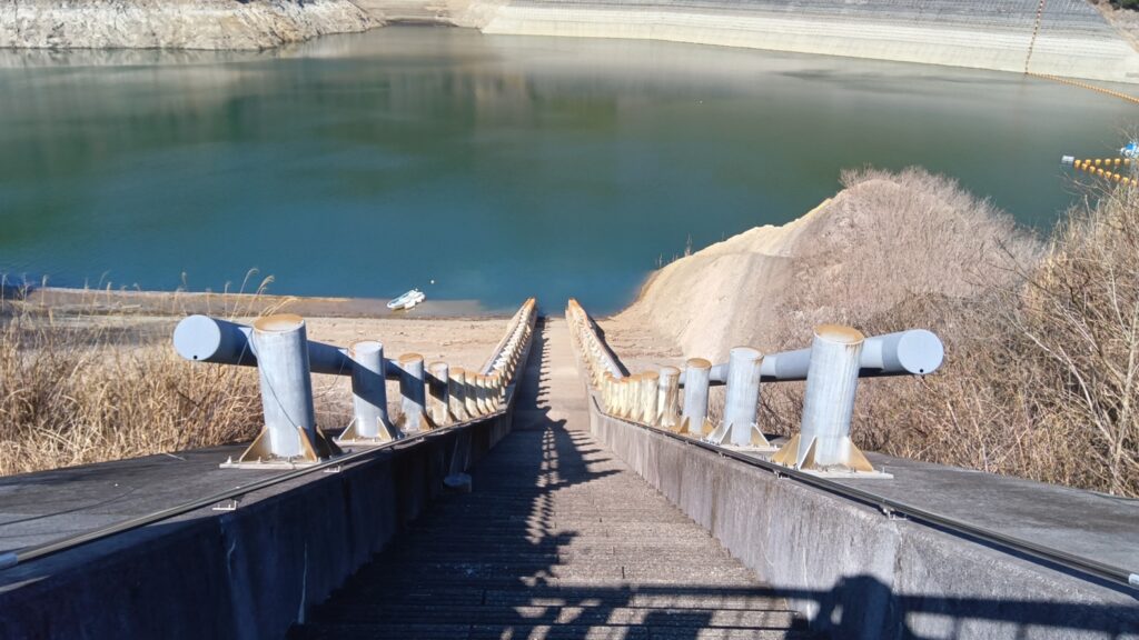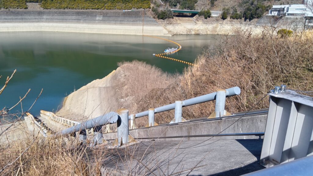 ダム堤体に近づくと,レール様の構造物が湖底に向かって伸びているのが見えました.