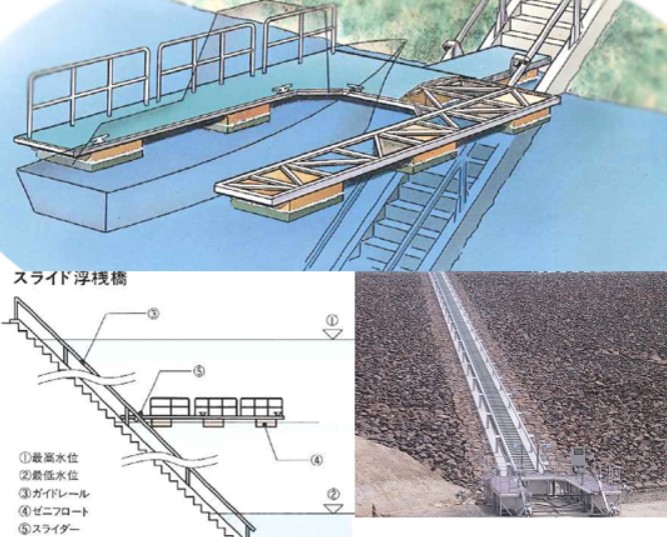 これは「スライド浮桟橋」という繋船設備で,ダム湖など水位の変化の大きなところで活躍し,長いガイドレールに沿って桟橋が上下します.