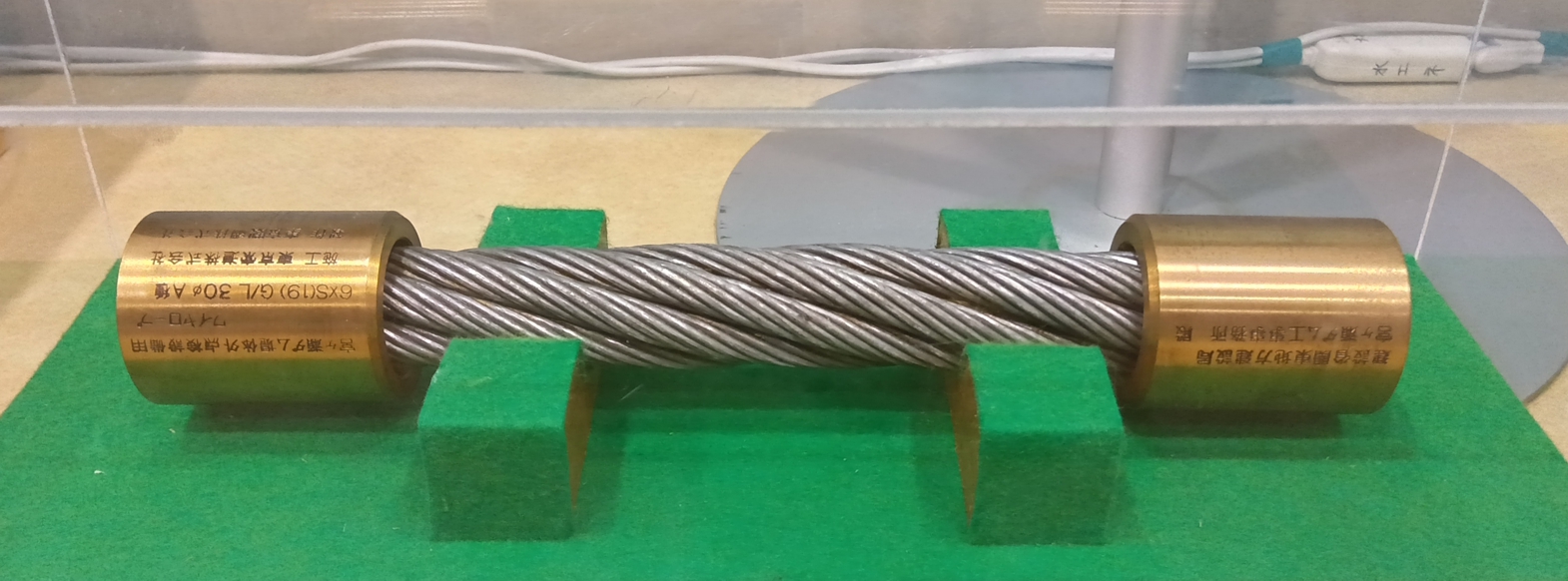 エネルギー館に展示されているインクライン用ワイヤロープの見本.逆さに展示されているので読みにくいですが,以下のようでした.「運輸省関東地方建設局 宮ヶ瀬ダム工事事務所 殿」「宮ヶ瀬ダム堤体外点検設備用ワイヤロープ/6xS(19) G/L 30φ A種/施工 東京索道株式会社/製作 東京製綱株式会社」.